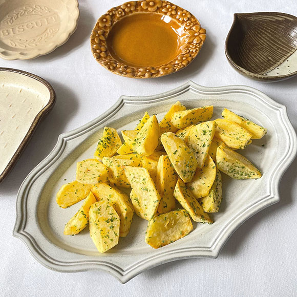 最近はお塩と青のりで仕上げるのが家族に人気なのでこの日も。焼きあがったばかりの「楕円稜花皿」の大きなサイズが使い勝手抜群で、シンプルなお芋料理もこの通り素敵に!