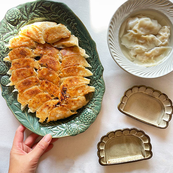 餃子は「銅緑釉 クリスマスリース皿」で。この器は寒くなってきた季節にぴったり。