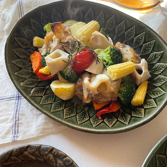 先月新しく焼きあがった「ツリーパターンの楕円鉢<オーブン使用可>」を使ってみると、野菜とツリー模様が相まって素敵な見た目になりびっくりでした。