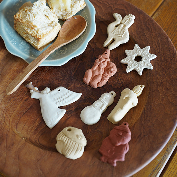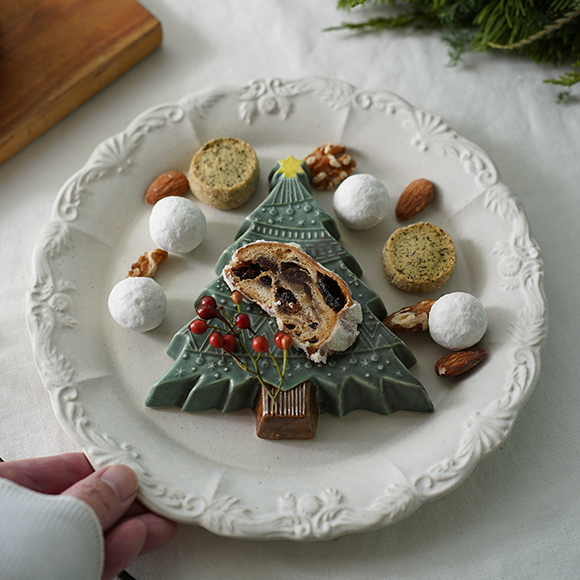 今年初めて作ったクリスマスをイメージした小さな台皿。クリスマスツリーと雪だるまの2種類を製作しました。どちらも、焼き菓子にぴったり!クリスマスツリーの小さな台皿は「ホワイトシルバーモチーフラウンドプレート」の上にのせ、台皿の上にはシュトーレンを、周りには焼き菓子をのせたらクリスマスおやつのワンプレートみたいな感じになって、思っていた以上に良い雰囲気になりました♪