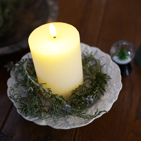 「コンポート皿6寸リースアネモネ」にはLEDキャンドルをのせて、その周りに庭の植物を置きました。コンポート皿はフルーツの器として使うことが多いのですが、クリスマス時期にはこうやって使うのもいいなぁ…。
