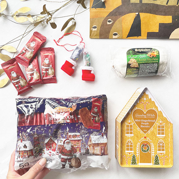 シュートーレン、サンタパッケージのシナモンビスケット、お家型の缶に入ったジンジャーマンクッキー、そして子ども用に長靴に入った飴を購入。