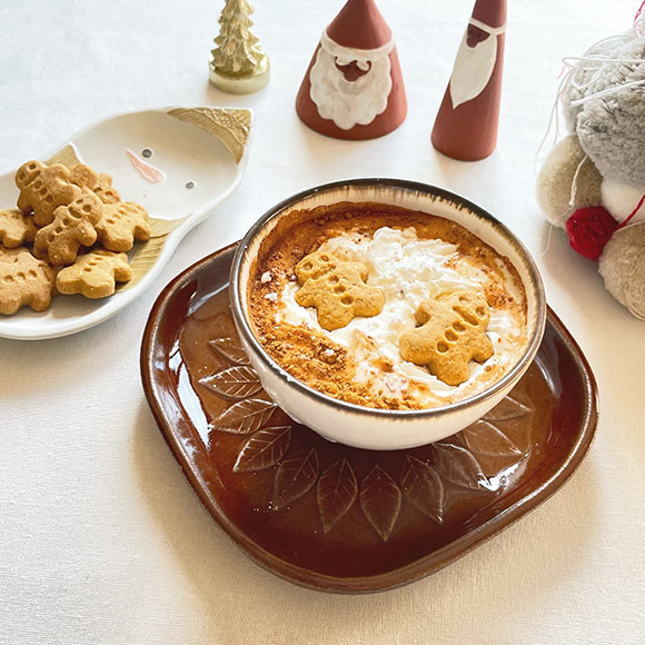 「brown line 白鳥まるカップ<黄色の冠>」と「ゆるしかく正方皿 リーフパターン」を合わせて冬らしいコーディネートで楽しむシナモンラテは最高でした。
