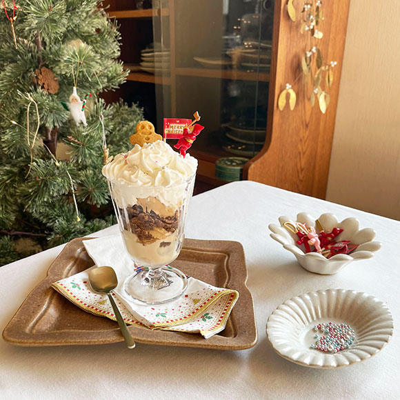 一人でシュミレーションしてみたパフェには、さらに器とグラスの間にペーパーナプキンでクリスマス感をプラス♪