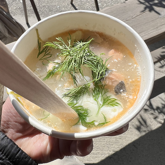 鮭とジャガイモのスープにディル(これがかなりのポイント)を添えていただくスープ。これがとってもおいしくて、家でも作ってみたい!と思っています。きっと、くまのスープボウルにとても良く似合うはず!