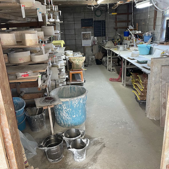 <写真は父親の細工場だった場所。現在は石膏型づくりをする作業場に>