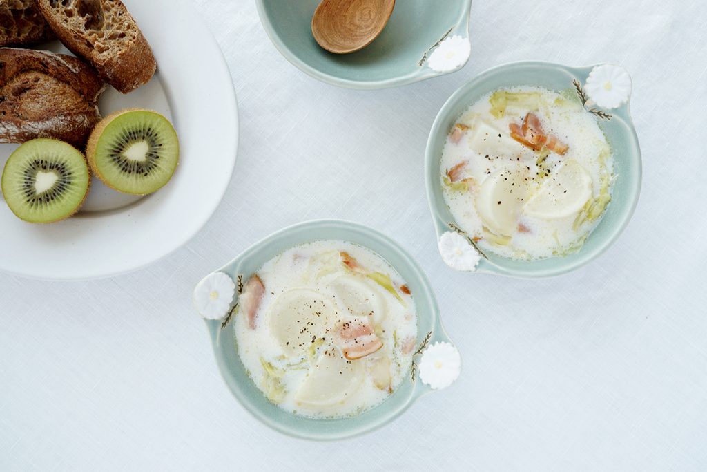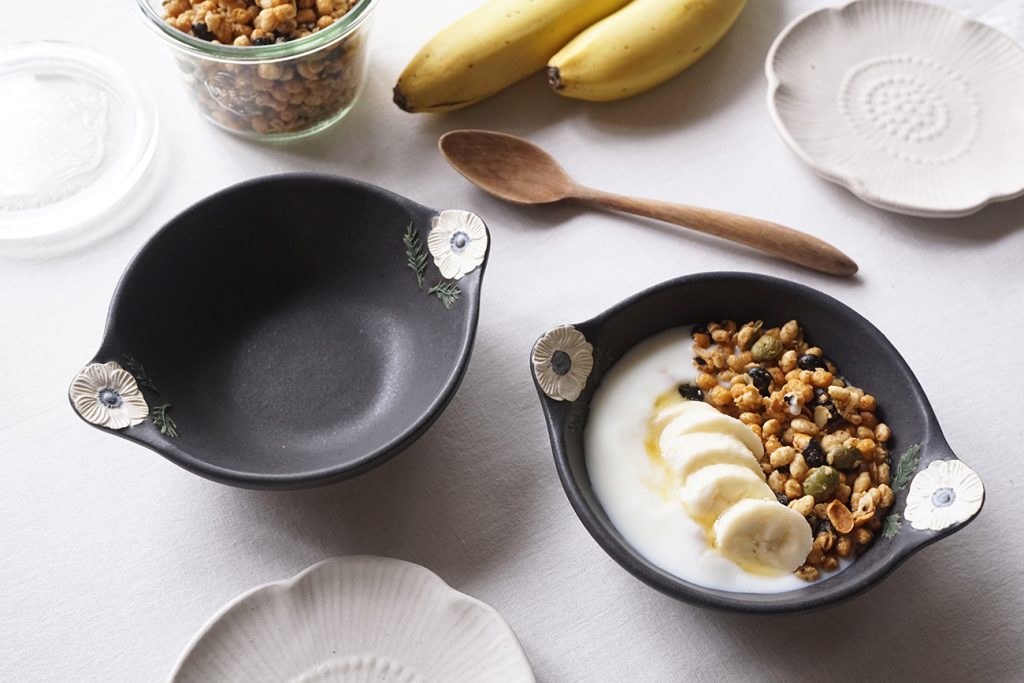 両サイドにちょこんとのった白いマーガレットが目を引きます。丸みのあるフォルムもかわいらしいやさしい雰囲気で、朝食のテーブルにもぴったりなボウルです。スープやシリアルやヨーグルトにもちょうどいいサイズ感!もちろん朝だけではなく、ランチのサラダやディナーのデザートなどなどいろいろなシーンで大活躍してくれる存在になると思います。