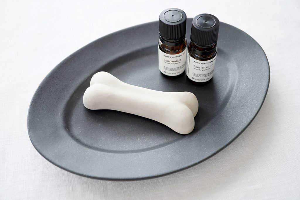 わんちゃんたちがおやつやオモチャとして大好きな「おしゃぶり骨」をイメージした、アロマストーンを作りました。釉薬をかけていないので、アロマオイルをたらしてアロマストーンとお使いいただけます。
