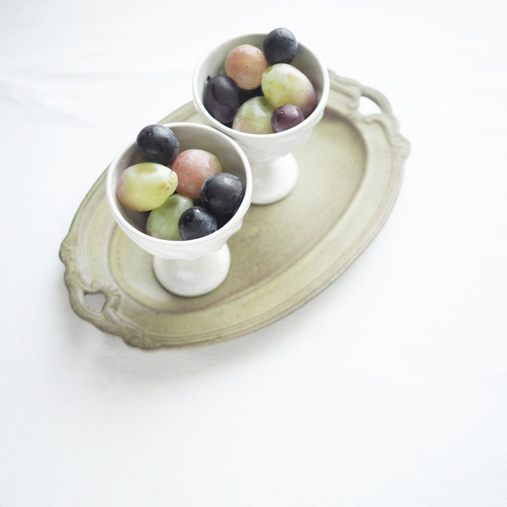 いつもは一種類ずつ食べていますが、ふと食べ比べみたいにするのもいいかも、とゴブレットに3色のぶどうを入れてみたら、カラフルさが際立って楽しくなりました。ぶどうの葉っぱみたいな色のシルバートレイ皿を、文字どおりトレイ代わりに。