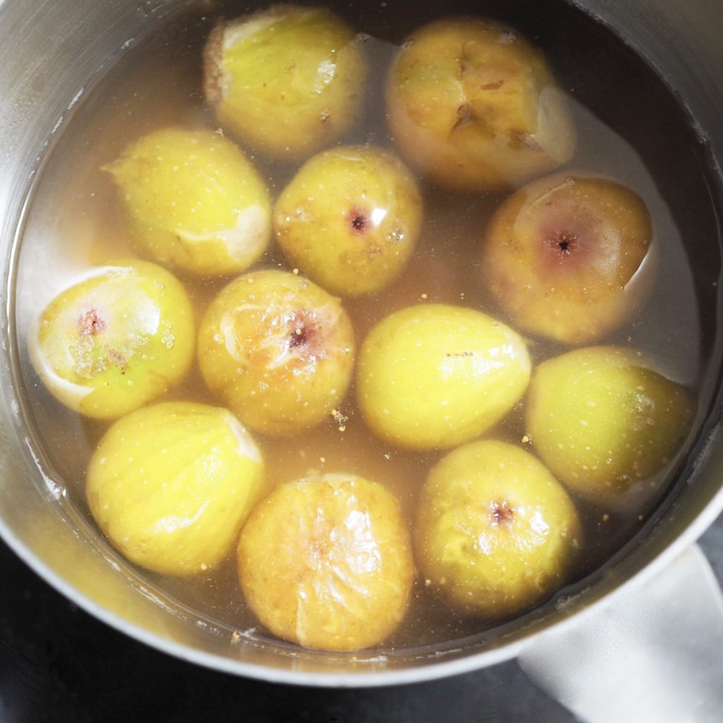 先述のいちじくは車で山形から東京まで運んできたので、そのまま全部食べるのはちょっと不安かも…と思い、ころころと丸ごとワイン煮にしてみました。赤ワインがあるとよかったのですが、これは白……煮ている間に、もともと柔らかくなっていた果肉が混ざり始めて、最終的にはロゼくらいの色味になっていました。笑