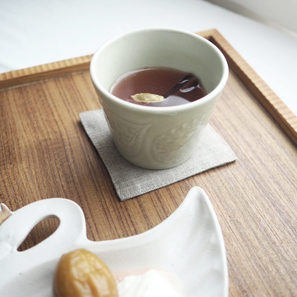 煮ている途中で、そういえば半端に余っていたスパイスがあったな…とシナモンやカルダモンを入れてみたら、おいしいホットワインになりました。鳥カップにいれて、白鳥と鳥合わせのうつわコーデに。