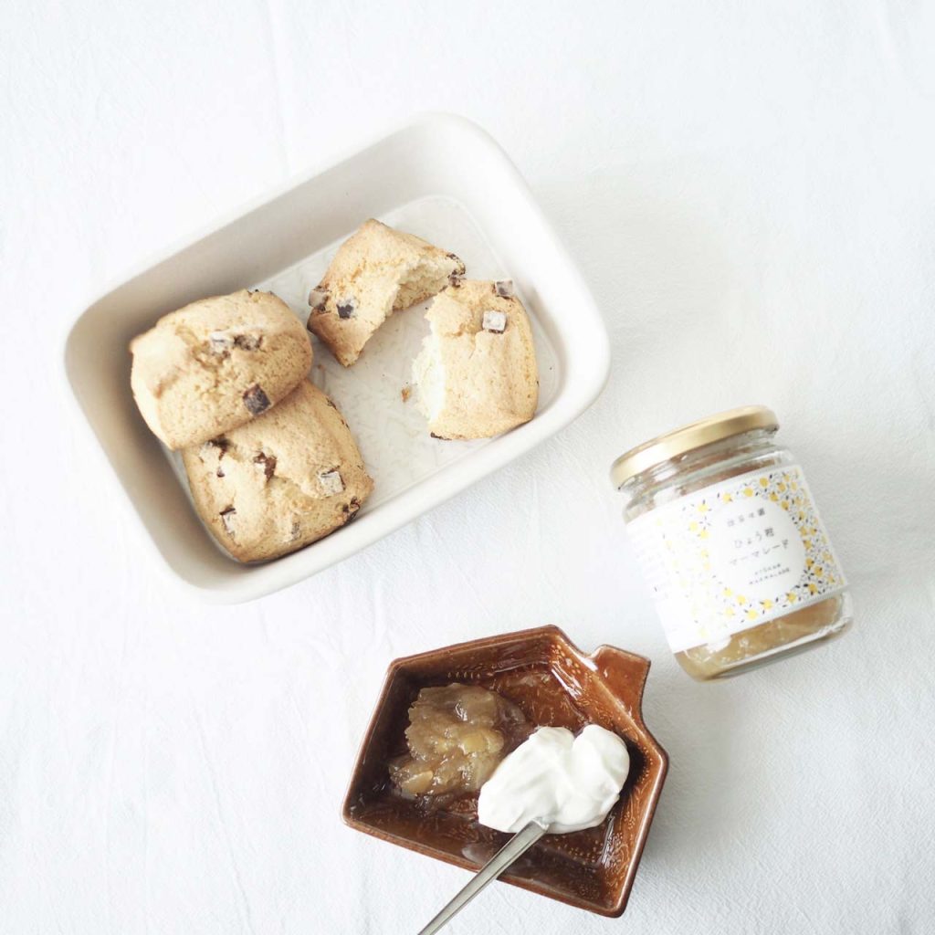 白いラウンドリムプレートにのせて、ひょう柑マーマレードとバターを。