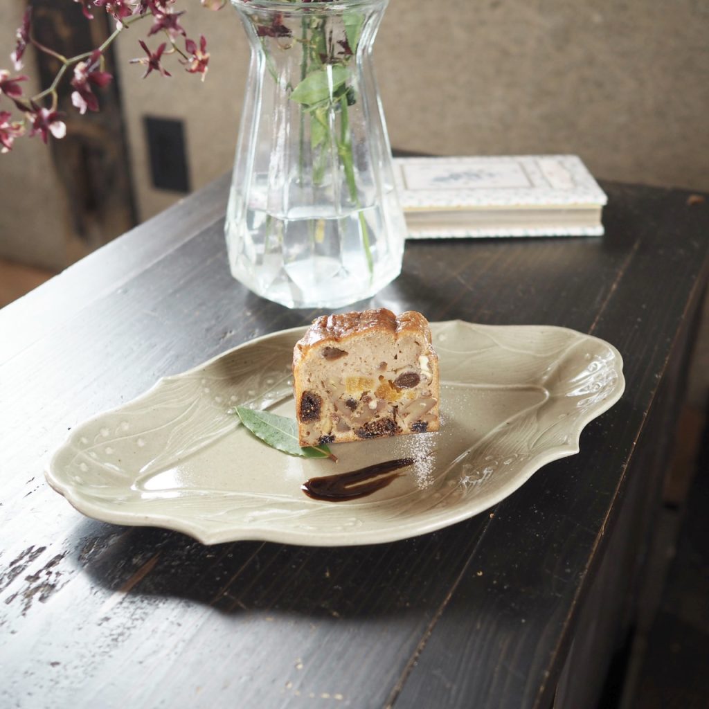 スズランの洋菱皿には、くるみとドライフルーツのケーキ。円形のお皿ではなく、あえて菱皿を使うと、余白がおしゃれに見えるんだなあと思いました。