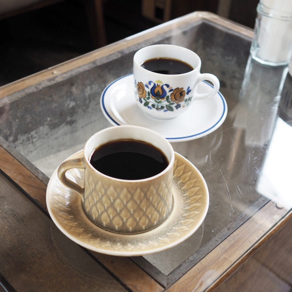 コーヒーはブレンドが3種類(+デカフェもあります)。私は中煎りのセカイスケッチブレンド(手前)、母はやや深煎りの沈没ブレンド(奥)をいただきました。