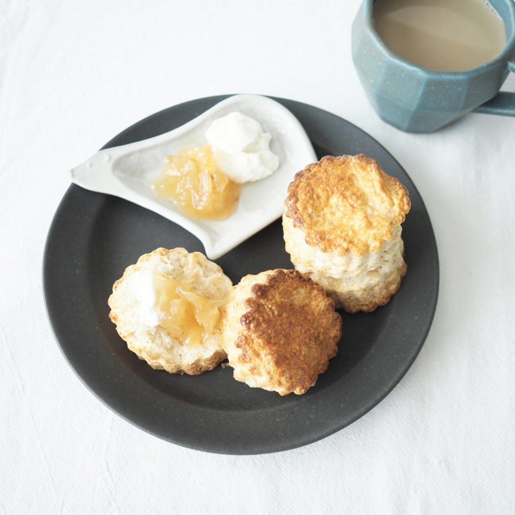 また、イベント時などにのみ販売されているというスコーンも特別にお持ち帰りさせていただきました。焼き菓子にはチャコールの器を合わせるのが好きで、ラウンドリムプレートにスコーン、こぐま皿にジャムなどを。オオカミの口がきれいにあいたスコーンは、リベイクしてみるとさっくりほくほく!朝ごはんにもおやつにもちょうどいい、絶妙なボリューム感でした。またイベントで出会えますように…!